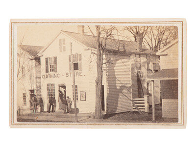 CDV of a small gathering of people standing outside a "Clothing Store," with what appears to be a framed photographic display on the right side of the building indicating that it also houses a photography studio or gallery of some sort. Uncredited, with "Porter's Building" penciled on verso. -- CDV of main street, Hartford, as per penciled notation on mount recto. Hartford, CT: E.P. Kellogg. -- View of a multi-story building identified on the side as the Franklin House, uncredited. -- Street scene showing a small group of people gathered outside a bakery. -- Street view of people standing outside a large building housing several businesses, one with a sign that appears to reads "Holmes." Uncredited (2-cent US Internal Revenue stamp on verso). -- View of an unidentified residence by H. Cook, as per ink stamp on verso. -- View of an unidentified residence. Wenona, IL: McAdam Bros. -- 4 CDVs of unidentified residences, each uncredited. -- Scenic view of a lake or stream with a mountain serving as the backdrop, with "Middle Mt." penciled on verso. Uncredited.