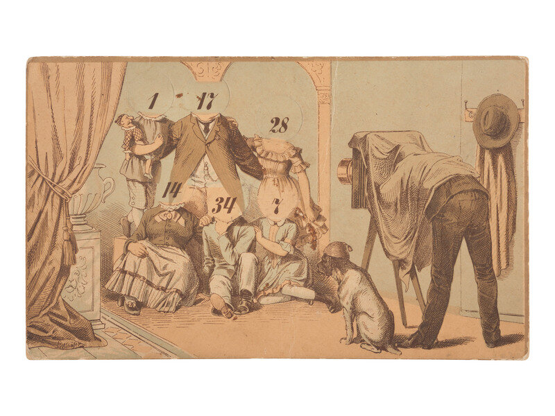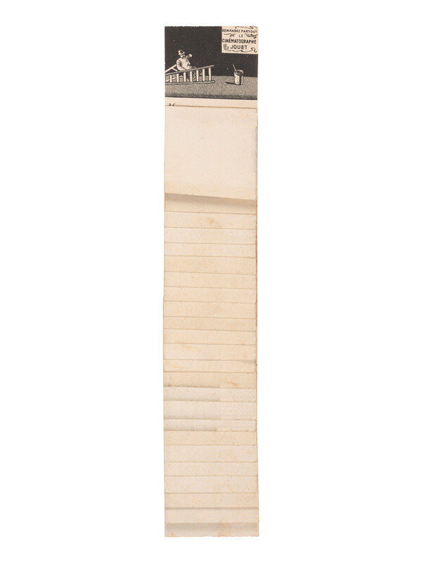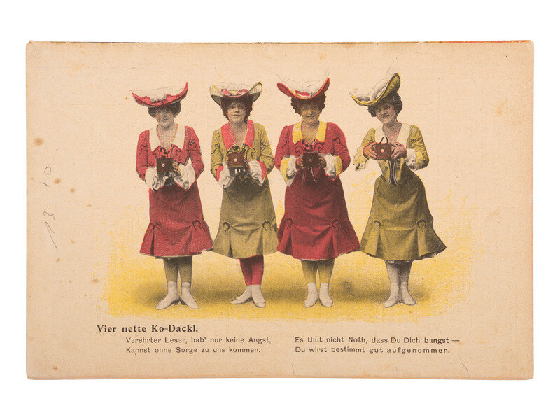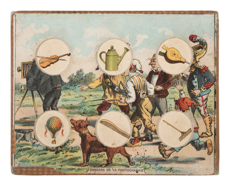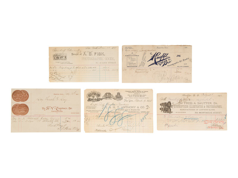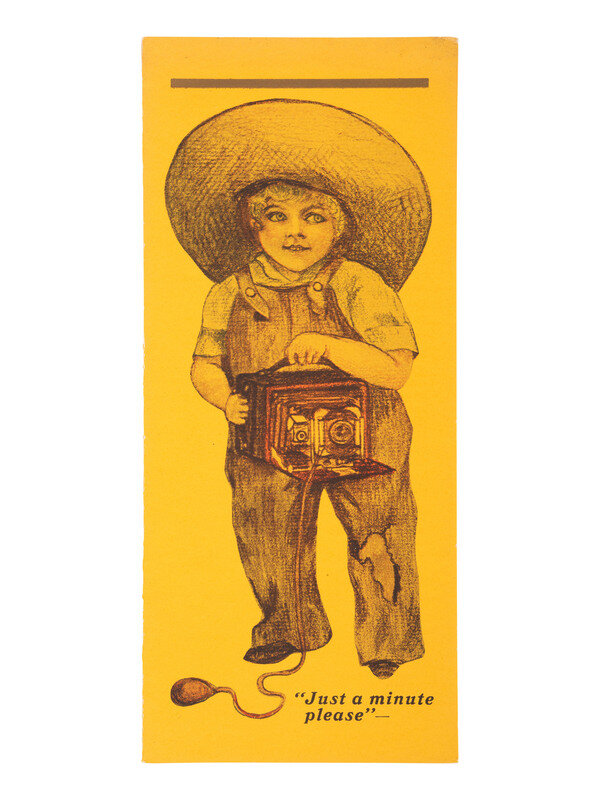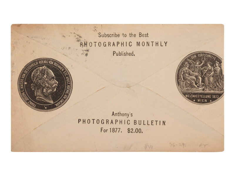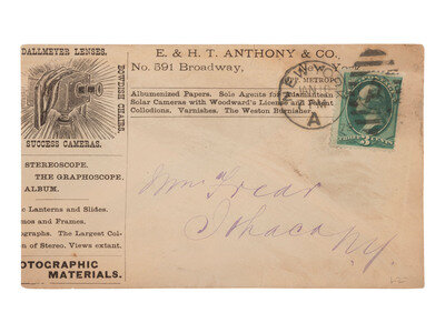 3 3/8 x 5 5/8 in. used cover, with promotional details for "E. & H.T. Anthony & Co., No. 591 Broadway, New York" printed at top. An illustration of a camera is featured at top left, partially surrounded by "Dallmeyer Lenses, Bowdish Chairs," and "Success Cameras," with additional highlights listed below. Reverse side with promotion for "Anthony's Photographic Bulletin for 1877, $2.00." With 3 cent stamp and New York cancellation (left edge trimmed, partially impacting text, some soiling to cover). -- 5 printed billheads for photographic goods companies including E. & H.T. Anthony (New York, 1888), A.D. Fisk Photographic Goods (New York, 1891), Knaffl & Bro. (Knoxville, TN, 190?), Fred A. Sautter (Brooklyn, NY, 1897), S.V. Courtney (Canton, OH, 1891). Each with manuscript notations (chipping and wear to edges). -- Small flipbook, approx. 8 1/2 x 1 1/2 in., comprised of series of 1 1/4 x 1 1/2 scenes of a man climbing and fall off of a ladder, with "Demandez Partout Le Cinematographe Jouet" featured in each scene (light soiling). -- 2 lithographed puzzles, 5 3/4 x 7 3/8 in., or smaller. The first, an untitled scene of a photographer with a dark cloth over his head, in the act of taking an image of a large family (edge wear, appears to be missing accompanying pieces). The second, captioned "Dangers de la Photographie," shows a photographer with his camera and a dark cloth over his head at far left, with various men standing behind him, who appear to be going after him (some soiling and surface wear, edge and corner loss, missing accompanying pieces). -- Das Kleine Witzblatt. 1903. No. 21. 7 3/4 x 5 in. illustrated magazine, the front cover featuring a woman posed before a camera that is visible at far left. The back cover depicts a group of four women, each holding a small box camera (toning, edge and corner wear to wrappers and some interior pages). -- Modern, promotional pamphlet issued by Griffith-Stillings Press, Boston, MA, with illustration of a child on the front cover holding a camera.
