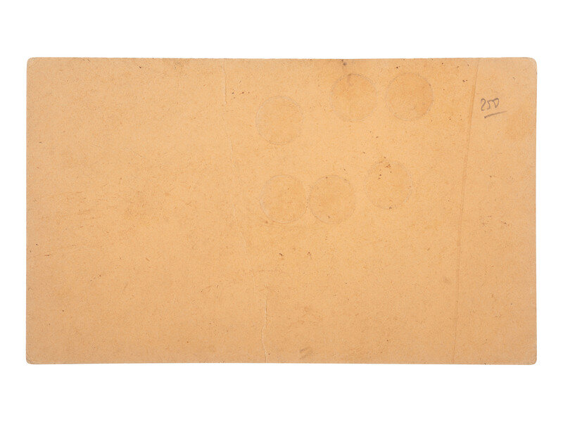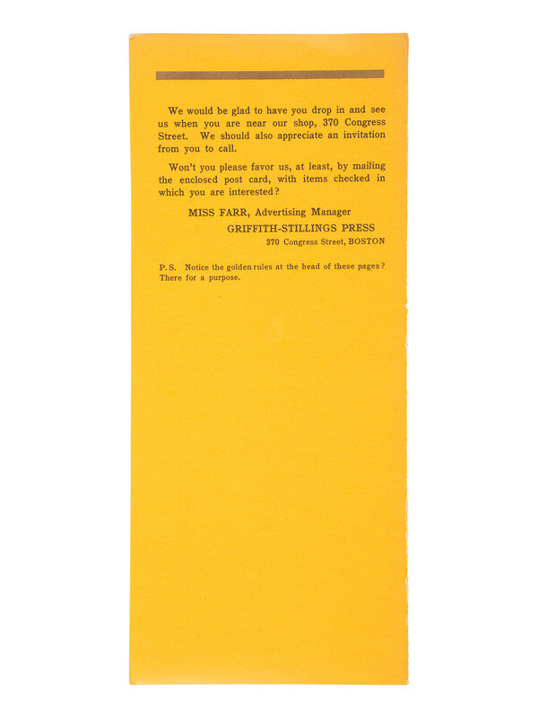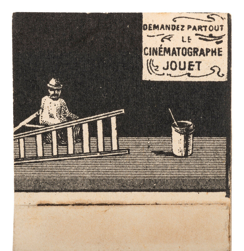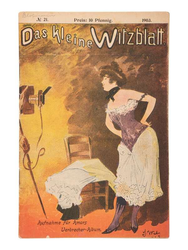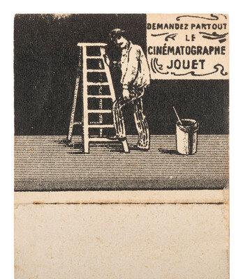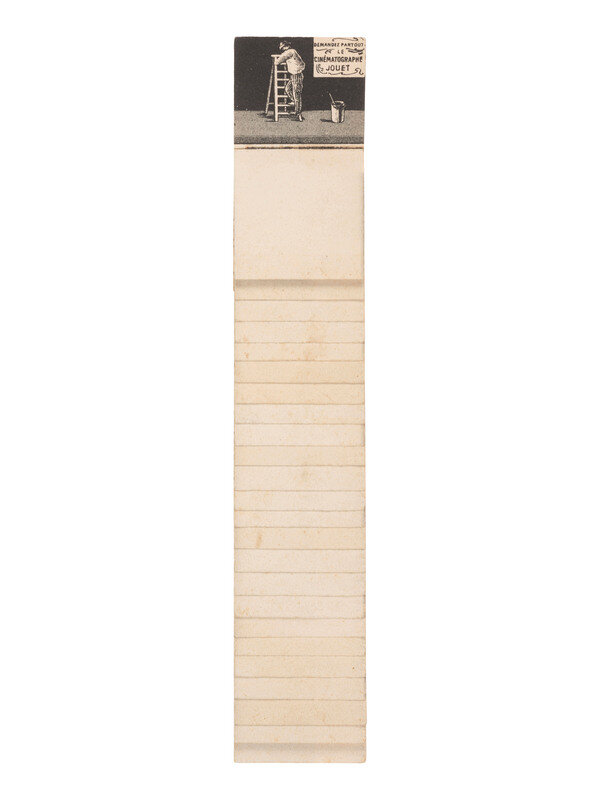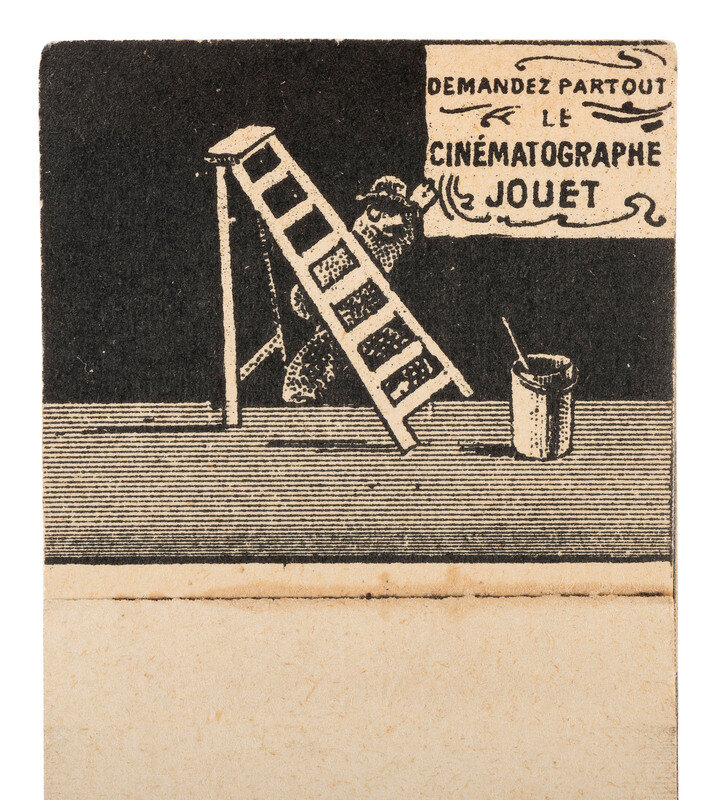 3 3/8 x 5 5/8 in. used cover, with promotional details for "E. & H.T. Anthony & Co., No. 591 Broadway, New York" printed at top. An illustration of a camera is featured at top left, partially surrounded by "Dallmeyer Lenses, Bowdish Chairs," and "Success Cameras," with additional highlights listed below. Reverse side with promotion for "Anthony's Photographic Bulletin for 1877, $2.00." With 3 cent stamp and New York cancellation (left edge trimmed, partially impacting text, some soiling to cover). -- 5 printed billheads for photographic goods companies including E. & H.T. Anthony (New York, 1888), A.D. Fisk Photographic Goods (New York, 1891), Knaffl & Bro. (Knoxville, TN, 190?), Fred A. Sautter (Brooklyn, NY, 1897), S.V. Courtney (Canton, OH, 1891). Each with manuscript notations (chipping and wear to edges). -- Small flipbook, approx. 8 1/2 x 1 1/2 in., comprised of series of 1 1/4 x 1 1/2 scenes of a man climbing and fall off of a ladder, with "Demandez Partout Le Cinematographe Jouet" featured in each scene (light soiling). -- 2 lithographed puzzles, 5 3/4 x 7 3/8 in., or smaller. The first, an untitled scene of a photographer with a dark cloth over his head, in the act of taking an image of a large family (edge wear, appears to be missing accompanying pieces). The second, captioned "Dangers de la Photographie," shows a photographer with his camera and a dark cloth over his head at far left, with various men standing behind him, who appear to be going after him (some soiling and surface wear, edge and corner loss, missing accompanying pieces). -- Das Kleine Witzblatt. 1903. No. 21. 7 3/4 x 5 in. illustrated magazine, the front cover featuring a woman posed before a camera that is visible at far left. The back cover depicts a group of four women, each holding a small box camera (toning, edge and corner wear to wrappers and some interior pages). -- Modern, promotional pamphlet issued by Griffith-Stillings Press, Boston, MA, with illustration of a child on the front cover holding a camera.