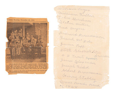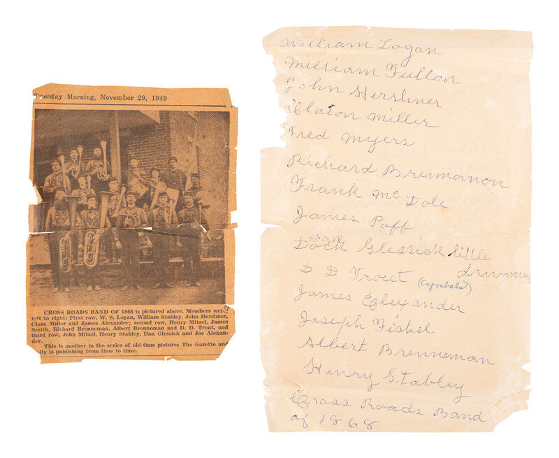 The image was reproduced in the Tuesday, 29 November 1949 issue of TheGazette and Daily (York, PA) with the following caption: "Cross Roads band of 1868 is pictured above. Members were, left to right: First row, W. S. logan, William Stabley, John Hershner, Clate Miller and James Alexander; second row, Henry Mitzel, James Smith, Richard Brenneman, Albert Brenneman and D. D. Trout, and third row, John Mitzel, Henry Stabley, Dan Glessick and Joe Alexander. This is another in the series of old-time pictures The Gazette and Daily is publishing from time to time."