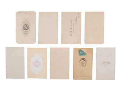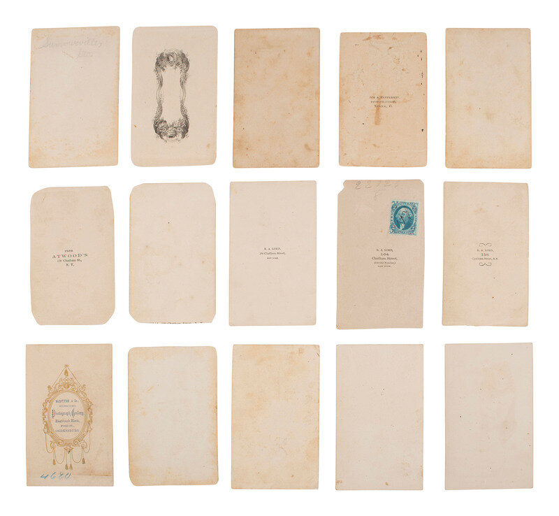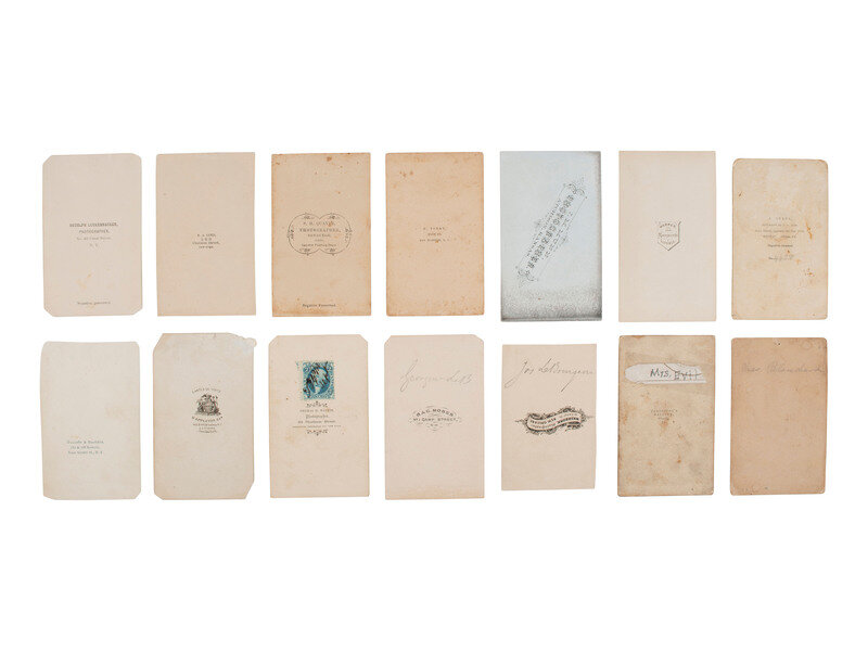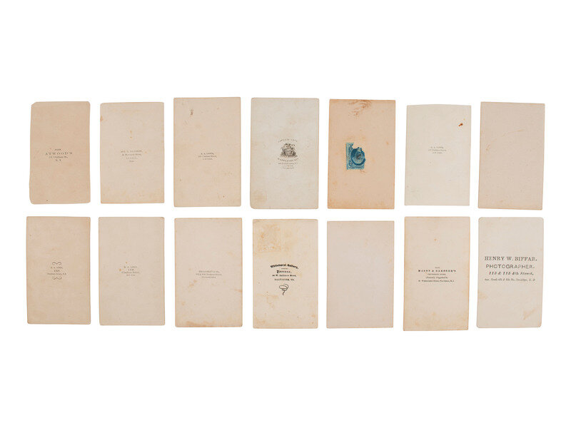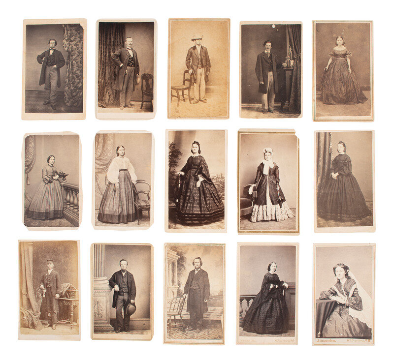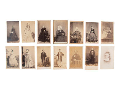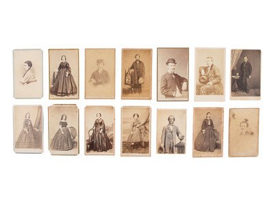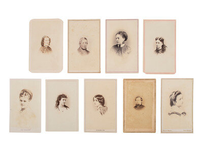 Lot comprised of approx. 52 CDVs of men, women, and children of varying ages, most unidentified, many credited to photographers and studios located throughout the United States. Several views were produced by New York-based photographers. A few CDVs include a 2-cent US Internal Revenue stamp on verso.