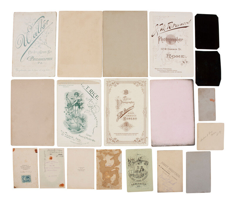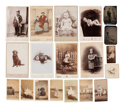 Highlights include: a cabinet card of a dog identified as "Topsy" via recto inscription. Milwaukee, WI: Small Studio, n.d. Credited on mount recto. -- A CDV of a cat. Rome, NY: J. M. Brainerd, n.d. Credited on mount recto. -- A diamond-shaped CDV portrait of two young women, one wearing eyeglasses, posed with their heads touching. Utica, NY: Gardner & Frey, n.d. -- An outdoor CDV of a group of men and children playing croquet. Oneida, NY: W. T. Richardson, n.d. -- An irregularly sized CDV (1 3/4 x 3 1/4 in.) of a young child sitting on an upholstered chair wearing a shirt with no pants. N.p., n.d. -- And many more. Conditions generally fair, with toning and surface soiling, general wear throughout.