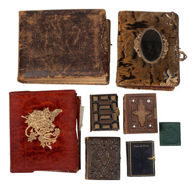 Albums include 2 cabinet card albums, one cabinet card and CDV album, 4 CDV albums, and one gem-sized tintype album. Photographs range in size from cabinet card to gem-sized tintype. Some albums only house a few images, including one album housing only a few silver gelatin snapshots.