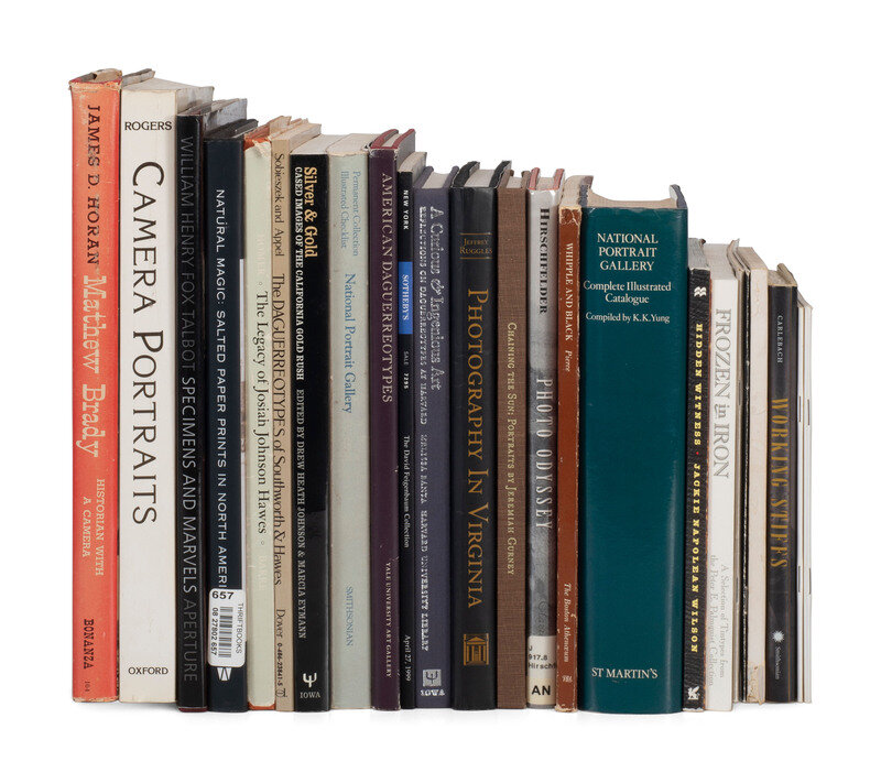 Photography in Virginia (Jeffrey Ruggles, Virginia Historical Society). -- American Daguerreotypes from the Matthew R. Isenburg Collection (Richard S. Field, Robin Jaffee Frank, Yale University Art Gallery). -- National Portrait Gallery: Permanent Collection Illustrated Checklist. 1982 Edition. (Smithsonian Institution). -- Silver & Gold: Cased Images of the California Gold Rush (Drew Heath Johnson, Marcia Eymann, eds., Oakland Museum of California). -- The Daguerreotypes of Southworth & Hawes (Robert A. Sobieszek, Odette M. Appel). -- The Strange and the Sublime: American Photography 1850-1920 (Charles Isaacs, Kemerer Museum of Decorative Arts). -- A Lasting Impression: The Daguerreotype in America (High Museum of Art). -- Reflecting on Photography 1839-1902: A Catalog of The Cotter Collection (Alan Cotter, Paulette Cotter). -- Frozen in Iron: A Selection of Tintypes from the Peter E. Palmquist Collection. -- Mathew Brady: Historian with a Camera (James D. Horan). -- and 15 others, including 2 Christie's catalogues, one Sotheby's catalogue, and one special edition of The Daguerreian Society with coverage of the sale of the Matthew R. Isenburg Collection. -- Together, 25 works. Conditions vary.