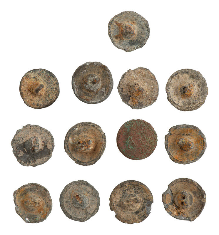 [AFRICAN AMERICANA] 13 excavated buttons, some identified to auctioneer and slave trader T. Porter.