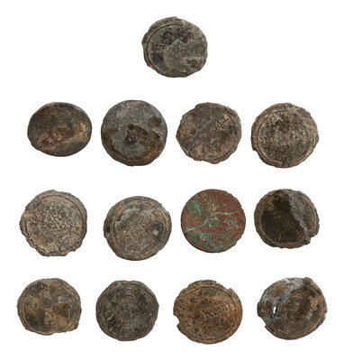 Lot comprised of 13 heavily oxidized and worn buttons, approx. 3/4 in. dia., identified by consignor on packaging as "Slave Buttons." Name identification is difficult, though at least most seem to be stamped "T. Porter," or "T.P.," likely referencing Thomas Porter, a slave trader and auctioneer operating out of the West Indies in the early 1800s. The buttons would have been worn on the enslaved person's clothing indicating ownership to Thomas Porter.
