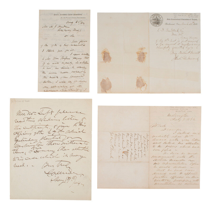 McKIM, James Miller (1810-1874). Autograph letter signed ("J.M. McKim") as corresponding secretary of the Pennsylvania Freedmen's Relief Association (previously the Philadelphia Port Royal [SC] Relief Committee). Philadelphia, 25 August 1864. Addressed to Mr. H.J. Hudson of Roxbury, Massachusetts. 3pp, on "Penn'a Freedmen's Relief Association" letterhead. McKim discusses a candidate who may desire to fill a vacant spot in the Penn. Freedmen's Relief Association.