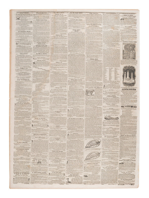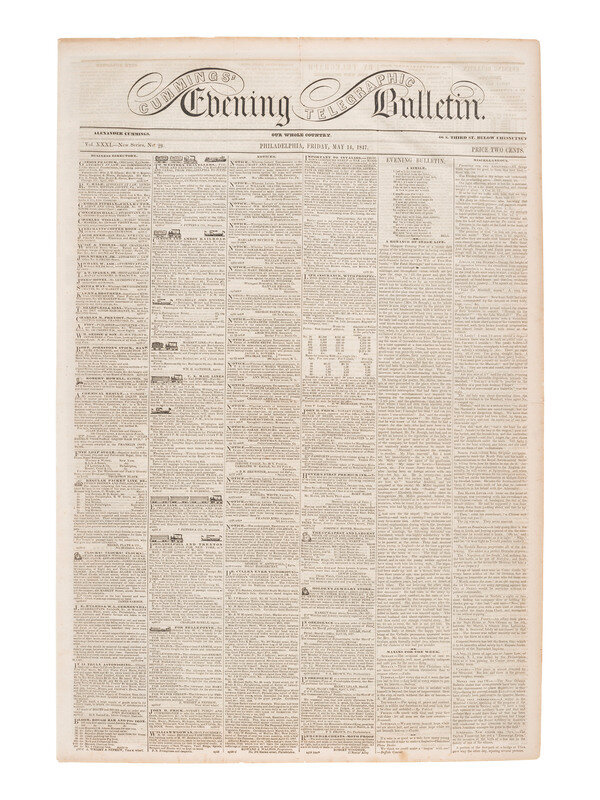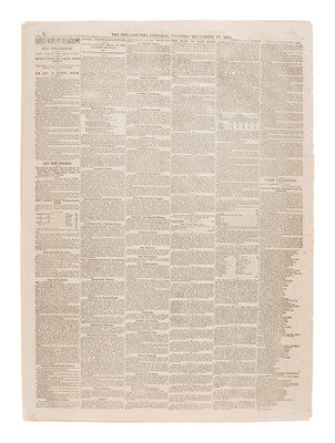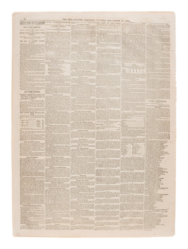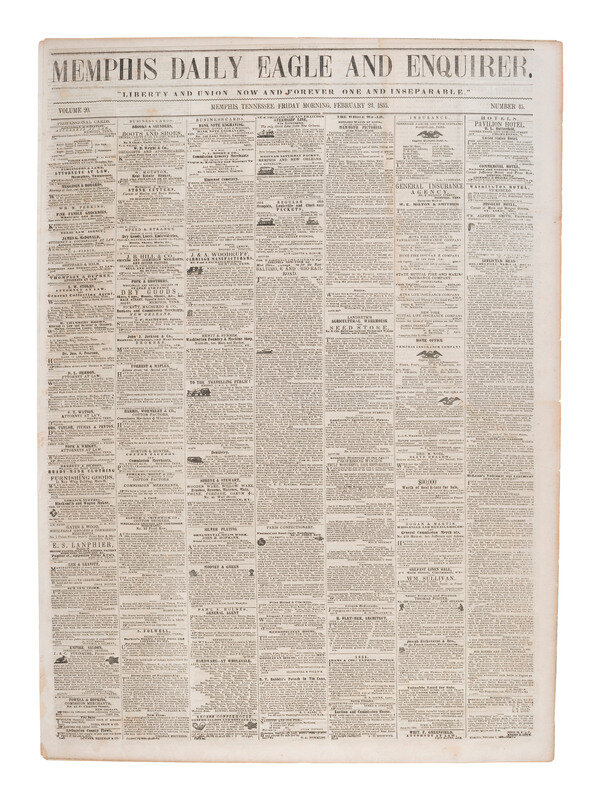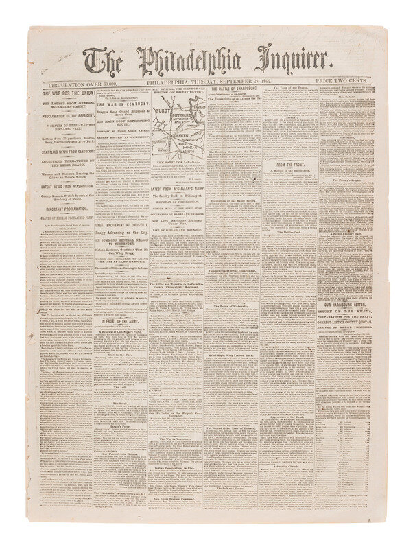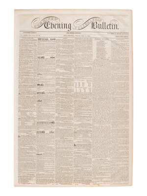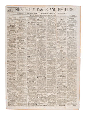 Memphis Daily Eagle and Enquirer. Memphis, Tennessee. 23 February 1855. Newspaper includes advertisements for slave auctions and rewards for "Ranaway" freedom seekers. -- The Philadelphia Inquirer. 23 September 1862. 8p. Front page with discussion of the Battle of Sharpsburg and page 4 with content on Lincoln's issuance of The Emancipation Proclamation. -- Cummings' Evening Telegraphic Bulletin. Philadelphia, 14 May 1847. 4pp.