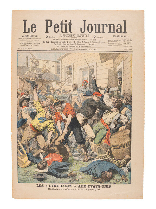 [With:] Le Petit Journal. Dimanche [Sunday] 7 Octobre 1906. Numero 829. Featuring color illustration of "Les (( Lynchages )) Aux Etats-Unis / Massacre de negres a Atlanta (Georgie)." Article in French on page 2.