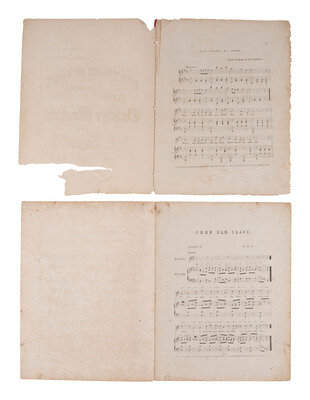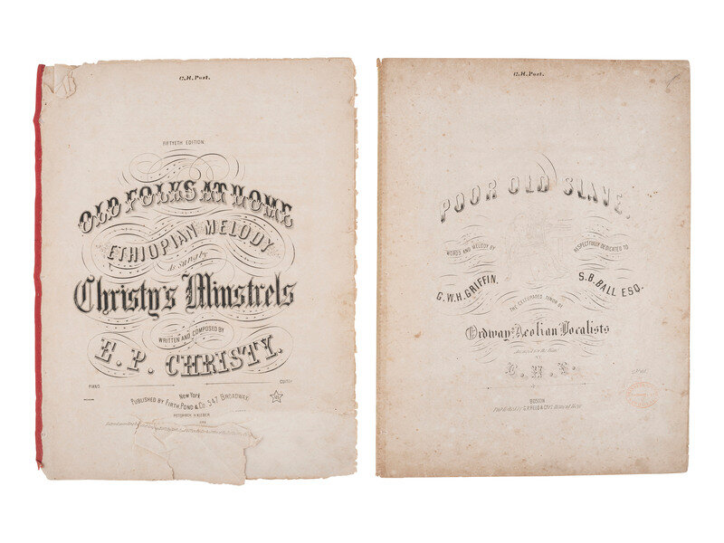 [With:] Two pieces of sheet music: "Poor Old Slave." 6pp, 10"X13 1/2", words and melody by G W H Griffin, the celebrated tenor of Ordman's Aeolian Vocalists, published by G P Reed & Co, Boston, 1851. Front cover is black and white, with a line drawing of an old slave, seated in a long topcoat, with his head resting on top of his cane. -- "Ethiopian Melody As Sung by Christy's Minstrels." 6pp.