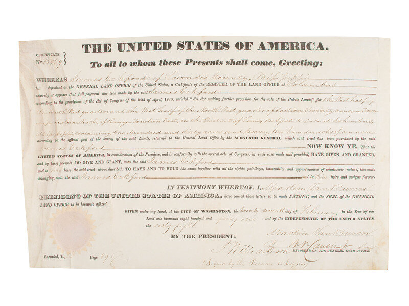 Land grant secretarially signed ("Martin Van Buren") by President Martin Van Buren. 1p, 16 x 10 in., granting 160 acres to James Eckford of Lowndes County, Mississippi. With seal of the General Land Office affixed at lower left.