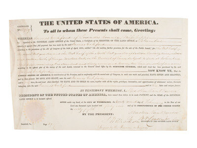 VAN BUREN, Martin (1782-1862). Secretarially signed land grant. Washington, D.C., 27 February 1841.