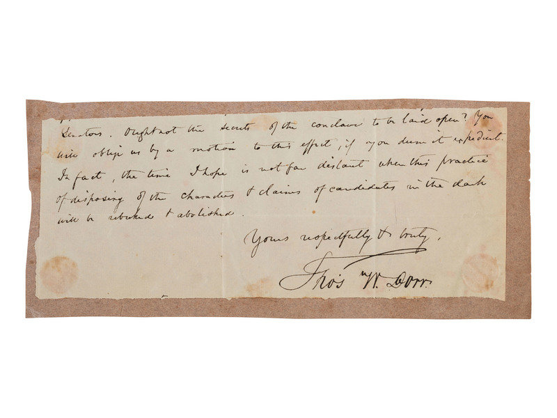 [With:] DORR, Thomas W. (1805-1854). 7 15/16 x 3 1/8 in. (staining, laid down on brown paper fragment). Partial ALS ("Thos W. Dorr"). In full: "...Senators. Ought not the secrets of the conclave to be laid open? You will oblige us by a motion to this effect, if you deem it expedient. In fact, the time I hope is not far distant when this practice of disposing of the characters & claims of candidates in the dark will be rebuked & abolished."