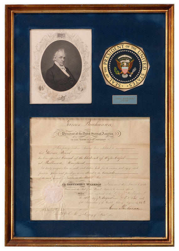 Diplomatic appointment signed ("James Buchanan"), as President. Washington, DC, 31 August 1860. 12 x 14 in. (sight) partly printed document. Embossed seal affixed to lower left. Countersigned by Secretary of State Lewis Cass. Matted and framed together with an 8 1/2 x 7 in. (sight) engraving of James Buchanan and an image of the seal of the president of the United States, approx. 28 x 19 1/2 in. overall.