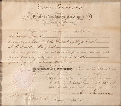 President Buchanan appoints Werner Dressel consul of the electorate to Hesse-Kassel.