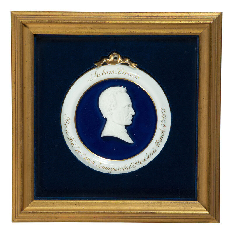 Approx. 6 3/8 in. dia. (sight) porcelain plaque with gilt text to rim reading, "Abraham Lincoln / Born Feb.y 12th - 1809, Inaugurated President, March 4th - 1861." Framed to 12 1/8 x 12 1/8 in. (some very light wear to gilt, not examined out of the frame). Lincoln silhouette portrait in bisque featured at center, surrounded by a field of cobalt. Plaque surmounted by gilt bow.