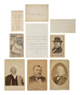 [With:] Republican ticket featuring portraits of Ulysses S. Grant and Henry Wilson along with the names of nominees for presidential electors. 4 1/4 x 8 in. printed ticket (discoloration, wear to edges). -- Advertising cartoon from Puck depicting caricatures of Ulysses S. Grant, Rutherford B. Hayes, and Benjamin Butler enjoying Capadura cigars. 5 3/8 x 3 1/4 in. printed cartoon with advertisement for Brooklyn's "'Old Times' Segar Store No. 2" on reverse. -- Tobacco label for Genuine Durham Tobacco, featuring portrait of Samuel J. Tilden when bottom portion is folded up and a portrait of Ulysses S. Grant when bottom portion is unfolded. Text above and below portrait beckons "True Born Democrats" to "Gaze On" the face of Tilden, and "All You Good Republicans" to "behold the visage" of Grant. New York: Donaldson Brothers, ca 1870s. 3 3/8 x 5 3/4 in. printed label (creased, with light soiling and wear to edges). -- 14 illustrated covers featuring likenesses of Ulysses S. Grant, Horace Greeley, Schuyler Colfax, Horatio Seymour, and Frank P. Blair, 6 of which are postally used. -- And 11 other printed items including Vanity Fair and Harper's Weekly illustrations, printed invitations, advertisements, and more. -- Together, 28 printed materials relating to candidates and campaigns from the 1868 and 1872 presidential elections.