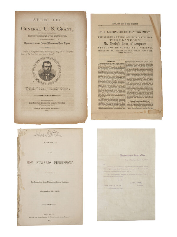 [Also with:] "Speech of the Hon. Edwards Pierrepont, Delivered Before The Republican Mass Meeting, at Cooper Institute, September 25, 1872." New York: Evening Post Steam Presses, 1872. 23pp, 5 3/8 x 8 in. (disbound). -- "Speeches of General U.S. Grant, Republican Candidate for Eighteenth President of the United States, Being Extracts from Speeches, Letters, Orders, Military and State Papers." Washington, D.C.: Union Republican Congressional Executive Committee, Gibson Brothers, Printers, 1868. 16pp, 6 1/8 x 9 5/8 in. (toning, chipping to page edges). -- "The Liberal Republican Movement. The Address of the Cincinnati Convention, the Platform, Mr. Greeley's Letter of Acceptance, Speech of Mr. Schurz at Cincinnati, Letter of Mr. Fenton to the Great New York Mass Meeting." 7pp, 6 x 9 1/4 in. (dampstains, chipping to page edges). N.p., [1872]. -- Together, 3 pamphlets.