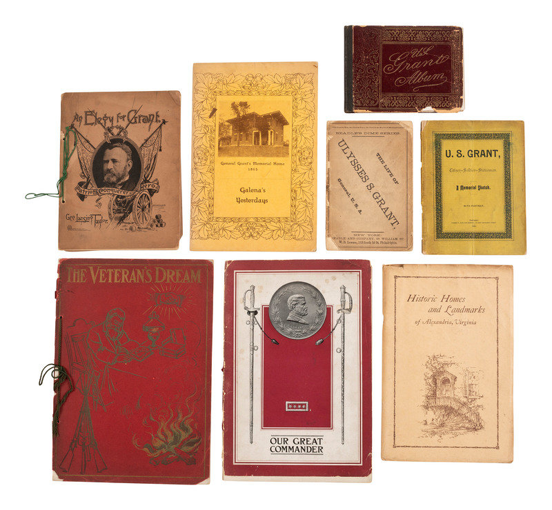 [With:] A group of 6 imprints associated with Grant's life, including memorials. -- "U.S. Grant Album" featuring 22 black and white panels, each approx. 5 1/4 x 4 1/4 in., showing the life of Grant. Ca 1886.