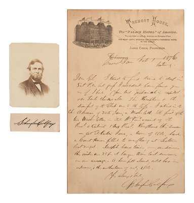 COLFAX, Schuyler. 17th Vice President under U.S. Grant (1869-1873), 25th Speaker of the House of Representatives (1863-1869). Autograph letter signed ("Schuyler Colfax"), recipient unknown. Possibly Cedar, Iowa (although location difficult to discern), 1 February 1876. 1 page, 5 3/4 x 9 in., on "Tremont House" letterhead which has been crossed out, old folds, brittleness near folds, few small separations near folds. The content is difficult to discern, but it appears that Colfax discusses reading about a reception for the President and Cabinet held in an Iowa town.
