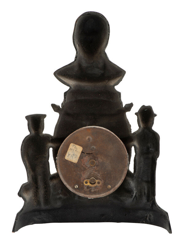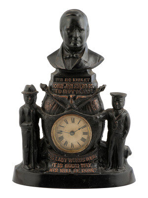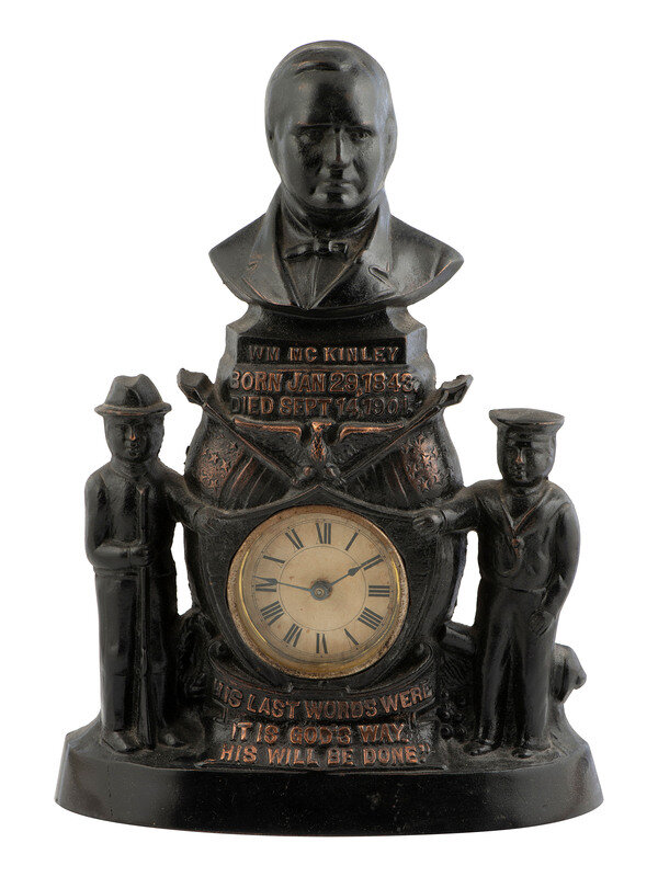 Pot metal clock with bronze finish, featuring clock face with roman numerals. Clock displays a frontiersman and a sailor on either side of the face with the bust of McKinley on top. Clock reads "Wm. McKinley, Born Jan 29, 1843, Died Sept. 14, 1801, His Last Words Were 'It Is God's Way. His Will Be Done.'" Approx. 12 1/2 in. tall.
