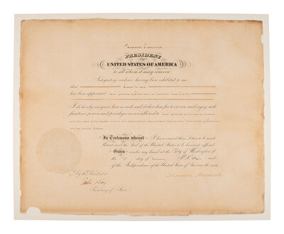 Diplomatic appointment signed ("Theodore Roosevelt"), as President. Washington, DC, 7 January 1902. 15 3/4 x 19 3/4 in. partly printed document, top edge of reverse side partially affixed to 16 3/4 x 21 in. board. Embossed seal affixed to lower left. Countersigned by Secretary of State John Hay.