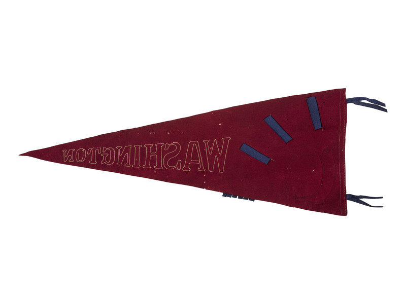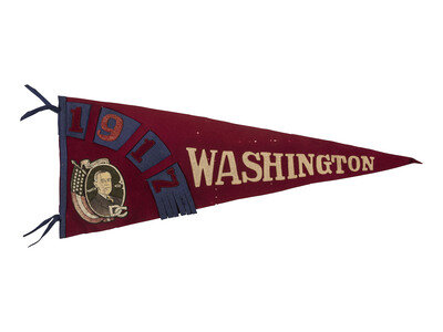 33 1/2 x 13 1/2 in. red felt pennant with machine appliqued white felt letters, blue felt edge, tassels, and detail with red felt appliqued numbers, and appliqued portrait of Wilson and American flag printed on black or green felt (some pinholes, minor discoloration to some letters, minor fading to portrait).