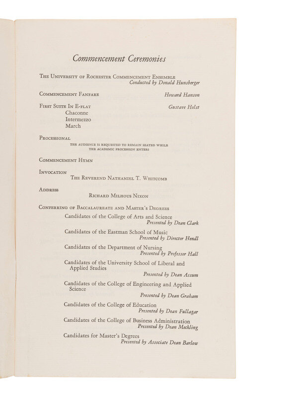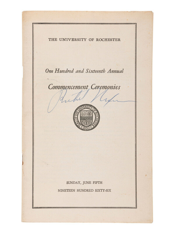 "The University of Rochester / One Hundred and Sixteenth Annual / Commencement Ceremonies." 40pp program, approx. 5 1/2 x 9 in., signed on cover by Nixon in blue ink.