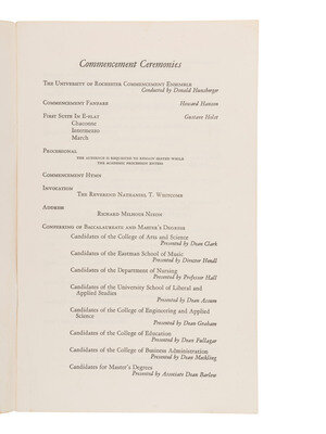 Former Vice President Richard M. Nixon (in office as Vice President 1953-61) signed this program during his so-called "Wilderness Years" during which he did not hold elected office. His commencement address delivered on 5 June 1966 at the University of Rochester was entitled "Academic Freedom." While at the commencement Nixon was supposed to have received an honorary degree from the university, but student protest over the announcement resulted in Nixon announcing his personal policy that he did not accept honorary degrees. The protests, alongside Nixon's refusal to accept the honorary degree, became national headlines.