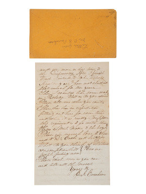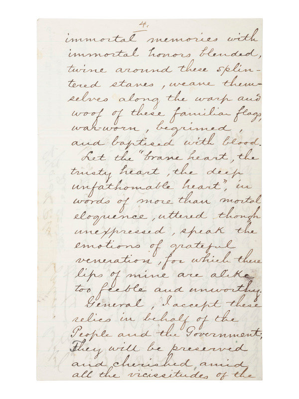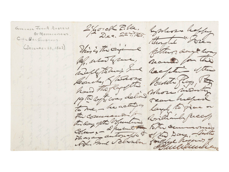 In December 1865, with the war over and virtually all Massachusetts units mustered out, a great ceremony was held in Boston known as the Returning of the Flags. All available veterans of the many Massachusetts regiments paraded through Boston then presented their battered regimental battle flags to the Governor. The verso of Andrew's letter appears to be a portion (in a different hand) from Andrew's remarks delivered at the ceremony. Andrew addressed his remarks to “General” referring to Major-General Darius Couch (1822-1897), the state’s highest ranking military official and a veteran of the Battles of Seven Pines, Oak Grove, Malvern Hill, Fredericksburg, Chancellorsville, and Gettysburg as well as the Carolinas Campaign. Verso reads in part, "General, I accept these relics in behalf of the People and the Government; They will be preserved and cherished...." Couch presented the 166 Massachusetts flags to the Governor.
