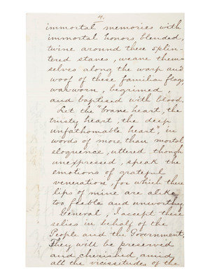 ANDREW, John Albion (1818-1867). Autograph letter signed ("John A Andrew"), as Governor of Massachusetts, to unknown recipient. [Boston], 22 December 1865. 1p, approx. 5 x 8 in. On verso of the 4th page of a patriotic speech related to the ceremonial Returning of the Flags to the Massachusetts State House following the close of the Civil War. Andrew writes with reference to flag of the 19th regiment which was delivered to him by Major General [Darius] Couch "he acting as commander for the day of the volunteer column." Andrew continues noting that "Adj Genl Schouler by whose happy thoughts 'Forefather's day' was named for the reception of the Battle Flags & whose industry & care helped largely to give a brilliant[?] success to the ceremonies of the Day."