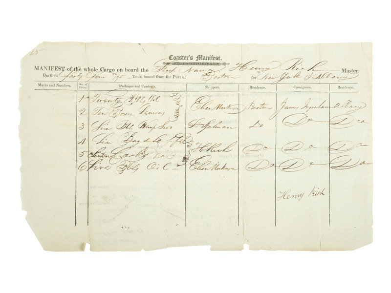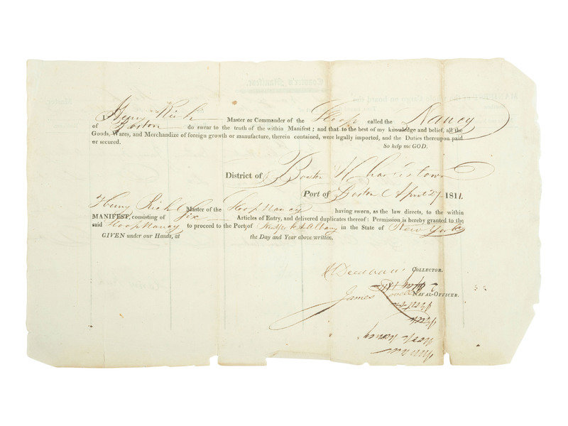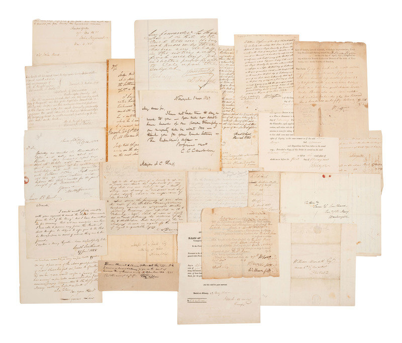 Approx. 39 autographs, including letters signed, autograph letters signed, and documents signed, highlighted by DEARBORN, Henry (1751-1829), partly printed document signed ("H Dearborn") as Collector of the Port of Boston. Boston, 27 April 1811. 2pp, approx. 13 x 8 in. (toning, creasing at folds, chipping). A "Coaster's Manifest" of cargo which includes oil, lemons, hemp, coffee, and nails. Countersigned by LOVELL, James (1737-1814) as Naval Officer. Dearborn was a Revolutionary War general, U.S. Congressman, and Secretary of War under Jefferson. Lovell participated in the Battle of Bunker Hill, was captured by the British, was a Massachusetts delegate to the Constitutional Convention, and a Signer of the Articles of Confederation.
