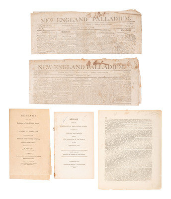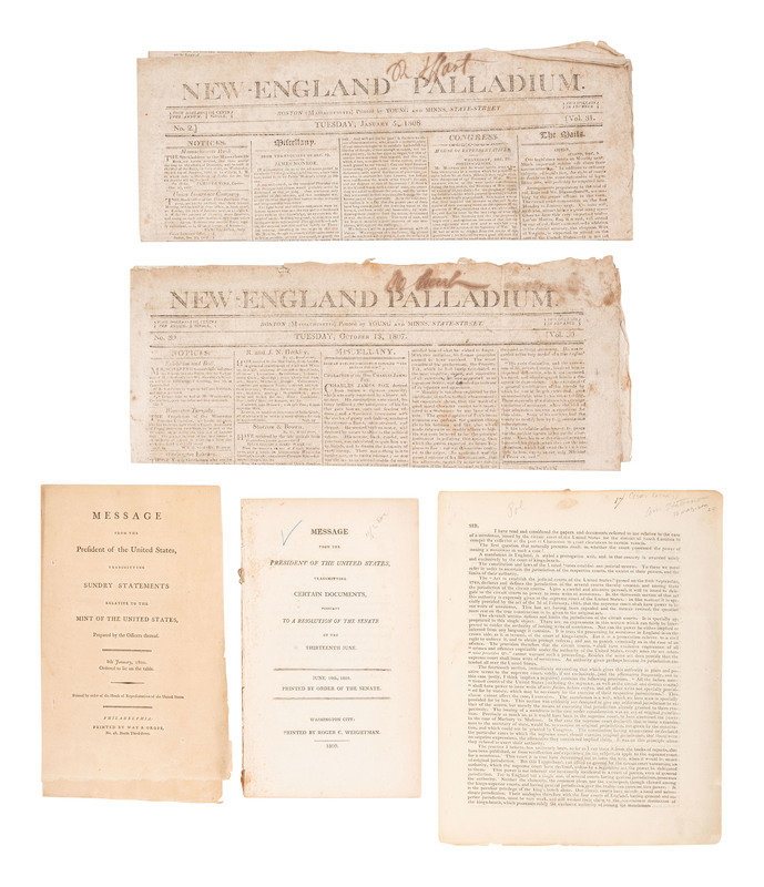 [With:] Print ephemera comprising: two issues of the New-England Palladium (13 October 1807 and 5 January 1808). -- "Message from the President of the United States, Transmitting Sundry Statements Relative to the Mint of the United States, Prepared by the Officers thereof." 8 January 1800. Philadelphia: Printed by Way & Groff. -- "Message from the President of the United States, Transmitting Certain Documents, Pursuant to a Resolution of the Senate of the Thirteenth June." 16 June 1809. Washington City: Printed by Roger C. Weightman. -- A message from C.A. Rodney to the President of the United States. 15 July 1808.