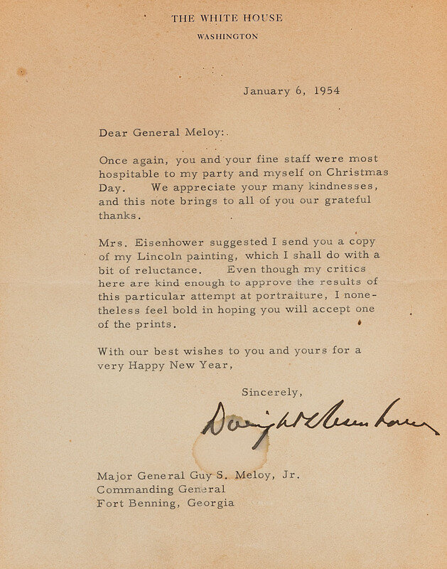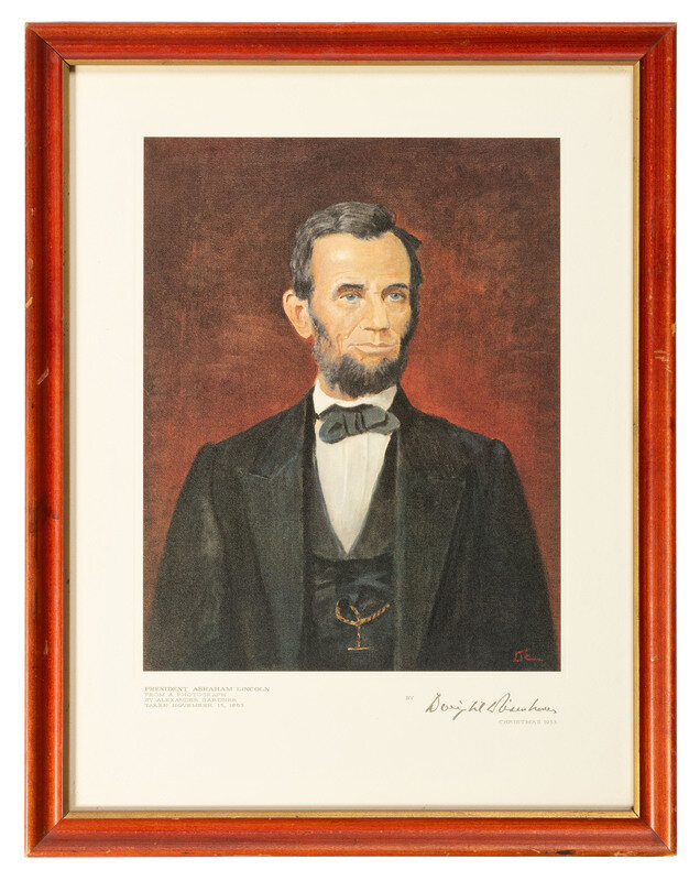 [With:] FORD, Gerald R. (1913-2006). 6 x 5 in. photograph of Gerald Ford on mount, which appears to be signed in the hand of Gerald Ford ("Gerald R. Ford"). -- Printed portrait of Abraham Lincoln after painting originally produced by Dwight Eisenhower. With printed caption and Eisenhower's facsimile signature with date in lower margin: "President Abraham Lincoln / From A Photograph / By Alexander Gardner / Taken November 15, 1863."; "By Dwight D. Eisenhower / Christmas 1953." 16 1/4 x 12 1/2 in. (including margins), framed, 18 1/2 x 14 1/2 in. Reverse side of frame features TLS addressed to General Meloy, signed by Dwight Eisenhower ("Dwight Eisenhower") as President. White House, Washington, DC, 6 January 1954. Eisenhower thanks Meloy for the hospitality he showed during a Christmas party, and notes that he is also enclosing a print after his painting by Lincoln (which is included here).