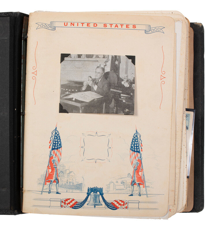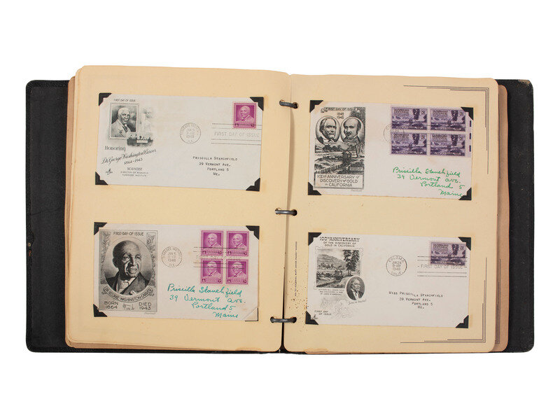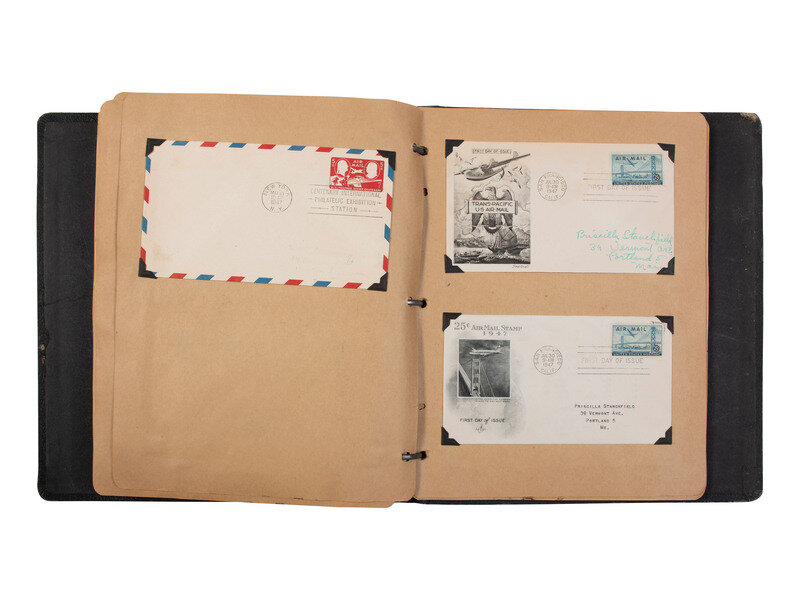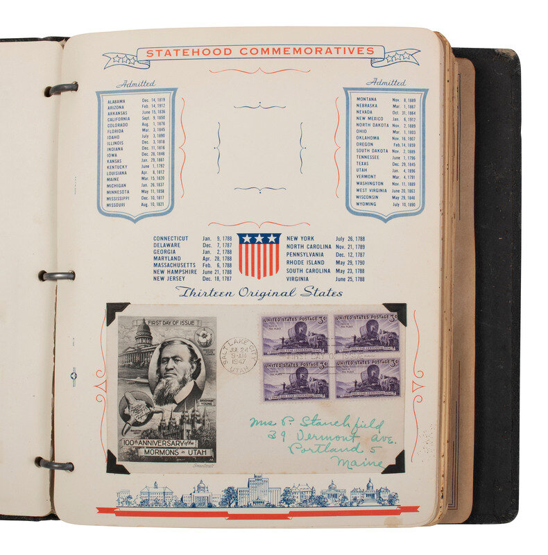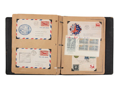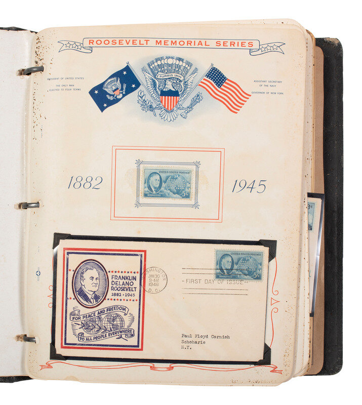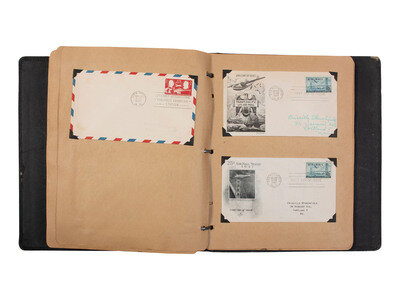11 1/2 x 10 in. album containing approx. 95 first day of issues and airmail covers, some mounted in corner taps on pre-printed pages identified to the "Roosevelt Memorial Series" or "Statehood Commemoratives," and others mounted in corner tabs on "Colonial buff cover pages" not identified to a specific series. Featured subjects include: Franklin D. Roosevelt. -- "Statehood Commemoratives" related to Vermont, Texas, Tennessee, Iowa, New Mexico, Mormons in Utah, Iowa, and others. -- Henry Wadsworth Longfellow stamp. -- Ft. Bliss. -- Health Stamps. -- "Honoring the Armed Forces." -- Philippine Island Independence. -- Smithsonian Institution 100th Anniversary. -- Alexander Graham Bell 100th Anniversary. -- Thomas A. Edison 100th Anniversary. -- Joseph Pullitzer 100th Anniversary. -- 100th Anniversary of United States Postage Stamps. -- US Frigate Constitution 150th Anniversary. -- George Washington Carver. -- 100th Anniversary of the discovery of gold in California. -- Princess Elizabeth's wedding. -- Apollo 11 Mission, July 20, 1969. -- And others.