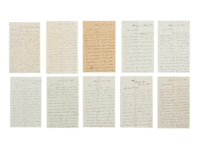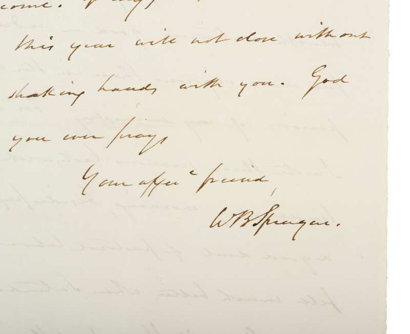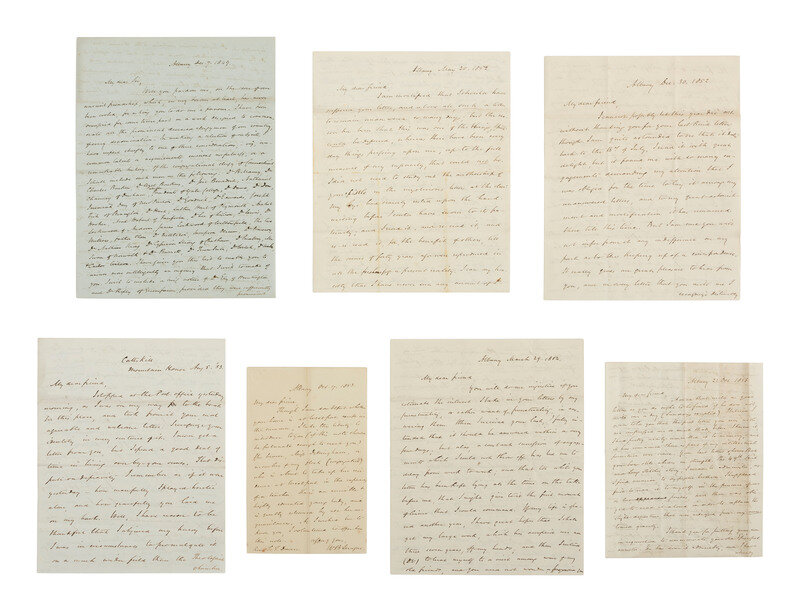Correspondence from Dr. William Buell Sprague to the Rev. Thomas Frederick Davies (1793-1865). Letters primarily written from Sprague's home in Albany, New York, with the exception of one letter each written from "Catskill Mountain House" and "West Springfield," and two letters written from Andover, Connecticut. Most letters approx. 4pp+. No covers present but interior addressee lines on five letters indicate a recipient "Rev. T.F. Davies." Letter content indicates that the Rev. Thomas Frederick Davies, a Connecticut-born Congregational clergyman and editor of religious magazines, was the likely recipient of all correspondence in the lot. Davies graduated from Yale College in 1813, while Sprague graduated in 1815, the two apparently having formed a close friendship during their overlapping college years as described by Sprague in a letter of 20 May 1852. The correspondence indicates the two remained close even decades after they parted ways.