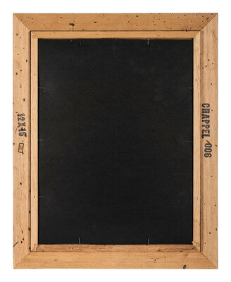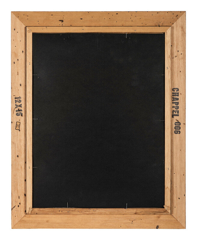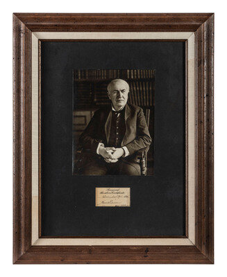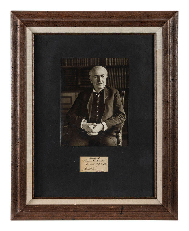 Partially printed document cut to 1 1/2 x 2 3/4 in., with "Received the above Certificate" printed above the date, followed by Edison's signature ("Thos. A. Edison"). Matted and framed together with an 8 1/2 x 6 1/2 in. portrait of Edison, overall, 20 x 16 in.