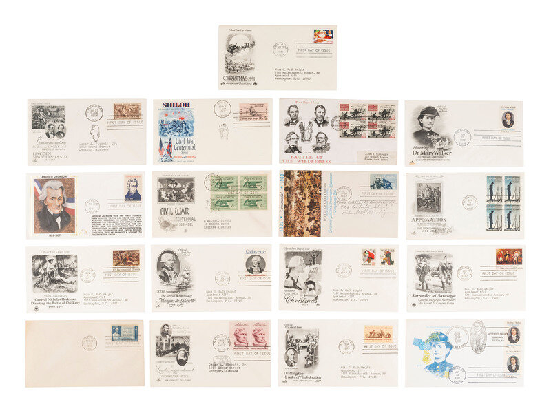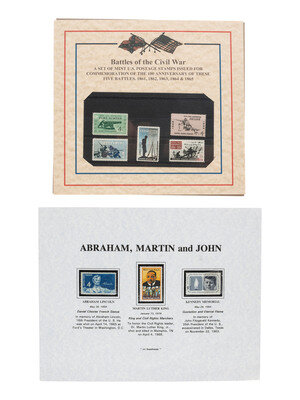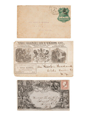 An assortment of Historic Americana including: a group of 7 pre-Civil War letters, several related to the Belcher family of Hinds Co., Mississippi; an 1859 receipt from Herrick, PA, documenting doctor's visit, charges for pasturing a horse and a cow, and expenses for corn; an undated letter indicating the necessity for return of game that "not in a marketable state"; a land indenture, [Jefferson County, ?], 29 February 1864; a Connecticut arrest warrant for Asa Grover who "with force and arms did make an assault on the person of William Warner...", East Haddam, 15 March 1864; an 1876 U.S. Centennial postal cover; a "The Home Bitters Co." postal cover; a pro-temperance themed postal cover; a poster offering a "$5,000 Reward" to be paid by the American Surety Company of New York for information resulting in the arrest of Courtney Glisson, a bank teller suspected of stealing "almost a half million dollars," [1926]; a set of U.S. postage stamps issued for commemoration of Civil War battles along with a separately housed group of postage stamps honoring Lincoln, MLK, and JFK; and a group of 16 First Day Covers celebrating various people, places, and events from American History.