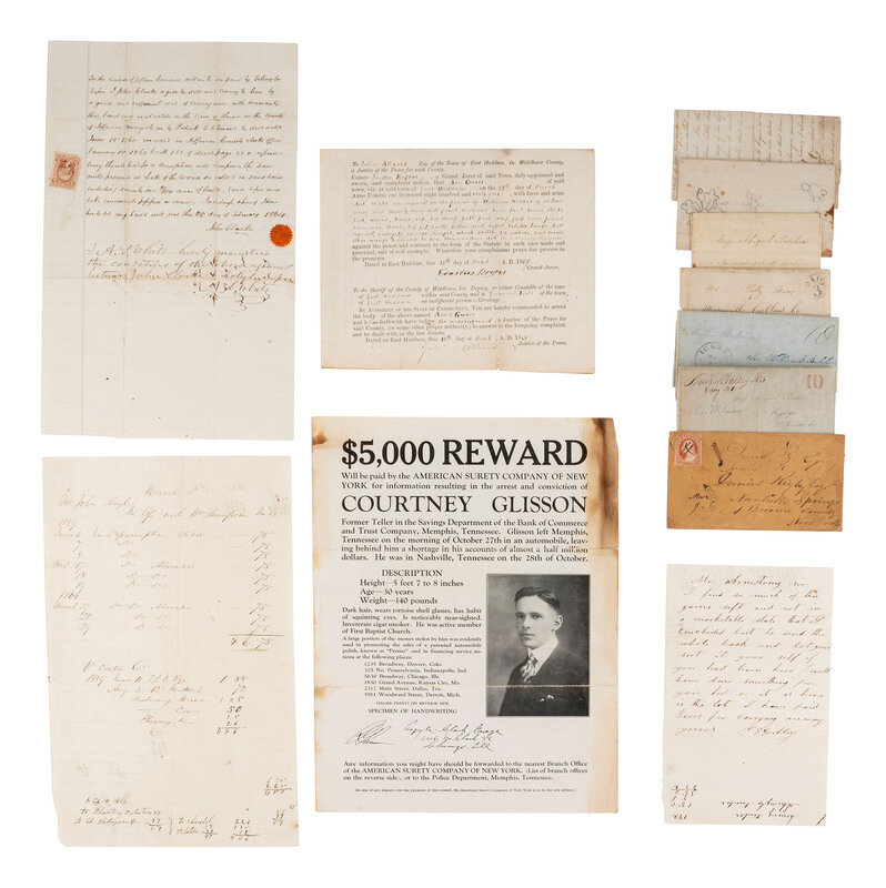 [AMERICANA]. Antebellum letters, First Day Covers, arrest warrant, rewards poster, and more.
