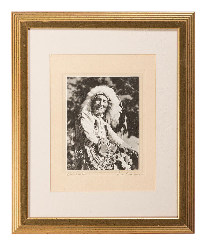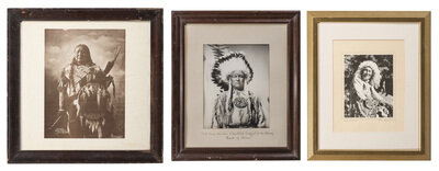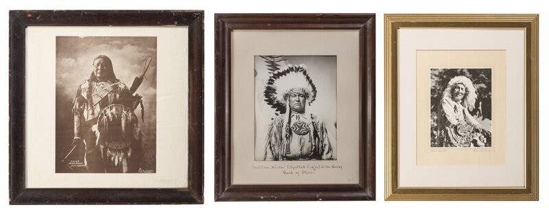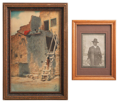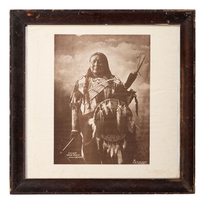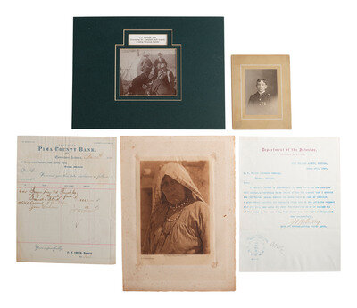 2 1/2 x 3 5/8 in. mounted silver gelatin photograph portrait of a possible Carlisle Indian School student wearing shoulder straps and two badges on his jacket. New York: Adams' Studio, n.d. -- CURTIS, Edward, photographer. A Cochitt Woman, 1925. 6 x 8 1/2 in. photogravure on tissue, mounted to 8 3/4 x 12 1/4 in. sheet of paper (image with adhesive residue to corners and some spotting, paper with spotting and wear). -- WILLIS, Joseph Roy, photographer. Framed hand-colored photograph of a child climbing a ladder on a Hopi structure, 9 x 12 3/4 in. overall. Signed bottom right "J. R. Willis." -- Typed letter signed ("J M Kelly") on Department of the Interior, U. S. Indian Service letterhead. Fort Belknap Agency, MT, 27 March 1895. Writing to a hardware company, Acting Indian Agent Major Kelly informs that he ordered two pump valves and only received one. -- A partly printed Pima County Bank document dated at Tombstone, AZ, 30 November 1881. Outlines funds remitted in the amount of $10,050.00. -- RINEHART, F. A., photographer. Chief War Path, Arapahoe. Omaha, n.d. Enlarged print, framed to 23 1/2 x 23 1/4 in. Signed in print by Rinehart, lower right. Titled in print, lower left. -- And 6 other items, including 4 large framed pieces. -- Together, 12 items.