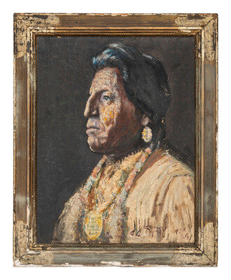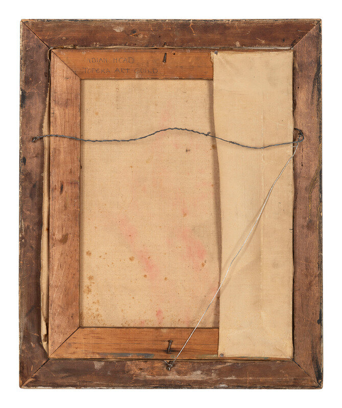 18 x 13 in. oil on canvas, housed in contemporary wood painted frame, 22 x 17 3/4 in. (paint chipped, though still attractive; frame heavily flaked). Signed “F.A.V. [19]29”, with the pictographic form of Two Guns White Calf’s signature added by the artist. With a medallion around his neck marked “Boy Scout from Fidelity [Kan]sas State Bank.” Stretcher marked on verso, “Indian Head. Topeka Art Guild” in ink.