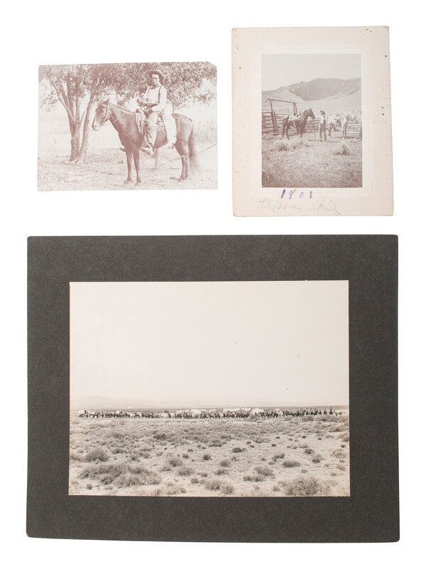 Cabinet card, outdoor view of a cowboy on horseback with a rifle in hand. Chicago, IL: The Wilson Studio. -- Cabinet card, studio portrait of a mustachioed cowboy wearing a wide-brimmed hat and an embroidered shirt adorned with fringe. He also appears to wear an earring. Sedan, KS: J.C. Avery. -- 3 photographs, approx. 3 7/8 x 5 3/8 in., or smaller, on cardstock mounts, showing cowboys in outdoor settings. Two photographs feature cowboys mounted on horseback, one of which is affixed to a cardstock mount with "Kodak Camera, Eastman Kodak Co, Rochester, NY" imprint on verso. The third shows a cowboy standing between two horses in a fenced-in enclosure with the mountains serving as a backdrop, with "1901" written in lower margin of mount. -- 6 1/4 x 8 1/4 in. photograph on cardstock mount featuring a distant view of a camp scene with several horses gathered together in front of what appears to be a cluster of tents. Uncredited.