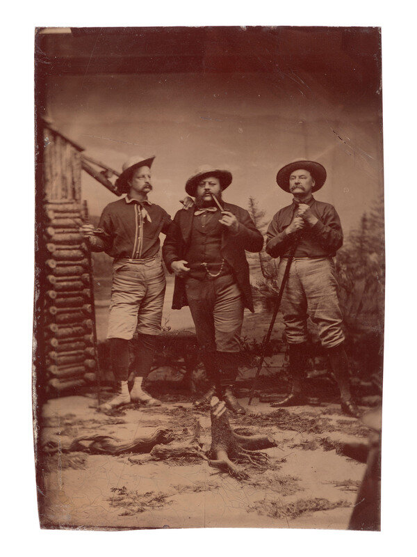 3 3/8 x 4 7/8 in. loose tintype featuring a group of three men posed together against a log cabin and wilderness background, with tree stump prop and leaves/moss scattered on the floor below. The men wear various types of work clothes and hats, and hold tools associated with the outdoors. The central, bearded, full-figured man holds a pipe to the corner of his mouth. (Creases and bends, surface scratches.)