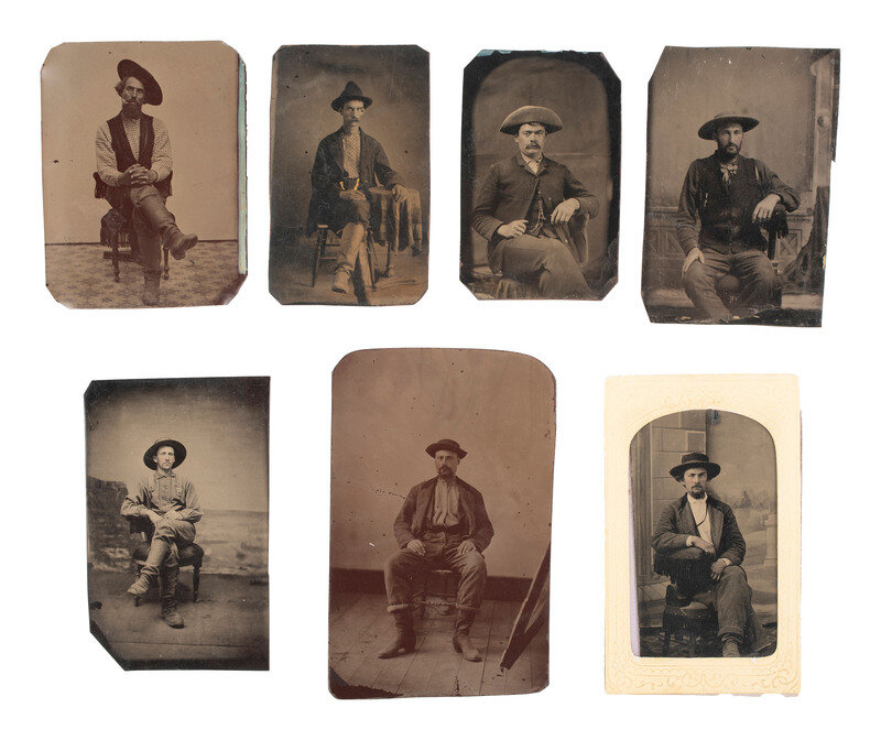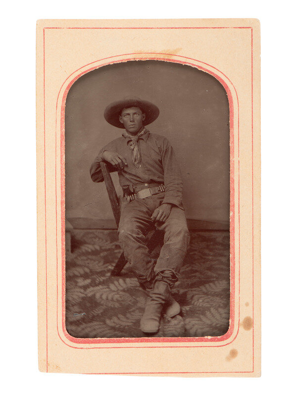 3 5/8 x 2 3/4 in. tintype of a cowboy sporting a cartridge belt and holster rig with the butt of what may be a Colt single-action visible. Housed under half of a ca 1870s-1880s-style red-ruled paper mat. Provenance: Cowan's 9-10 June 2005 Historic Americana Auction, Lot 1158. -- 7 tintypes showing cowboys and other rough-and-tumble characters seated in studio settings. The subjects wear wide-brimmed hats in varying styles, and at least three of the men wear tall leather boots. One of the subjects is shown with his head cocked to the side while smoking a pipe.