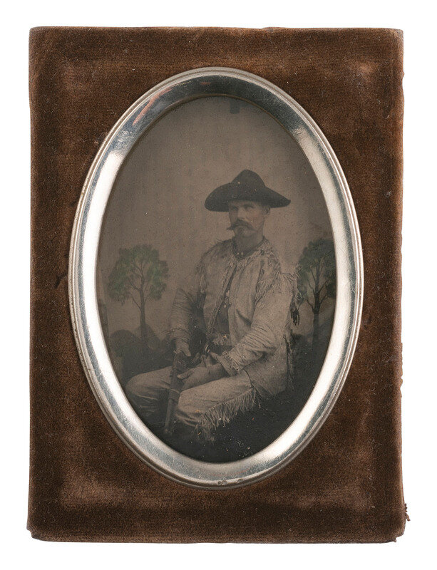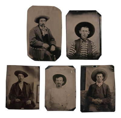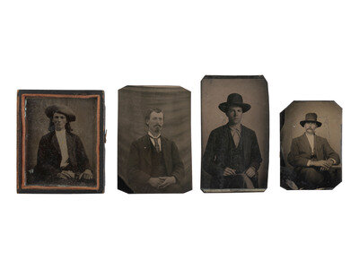 3 1/2 x 2 1/4 in. lightly hand-colored tintype portrait of possible scout wearing a fringed buckskin jacket and pants, holding what may be a Model 1873 Winchester lever action carbine. Housed inside frame with cover glass and velvet mat (partial loss to emulsion near lower margin as a result of cover glass previously sticking to plate, frame unsealed). -- Ninth plate tintype portrait of a young man with a long hairstyle, wearing a wide-brimmed hat. He holds what may be a playing card in his hand. Housed in pressed-paper case (fully separated at hinge). -- 8 seated portraits of cowboys and other compelling characters of varying ages, many wearing wide-brimmed hats. Notable subjects include a young cowboy wearing a large cravat and another young cowboy wearing a checkered shirt and vest.