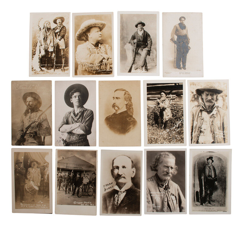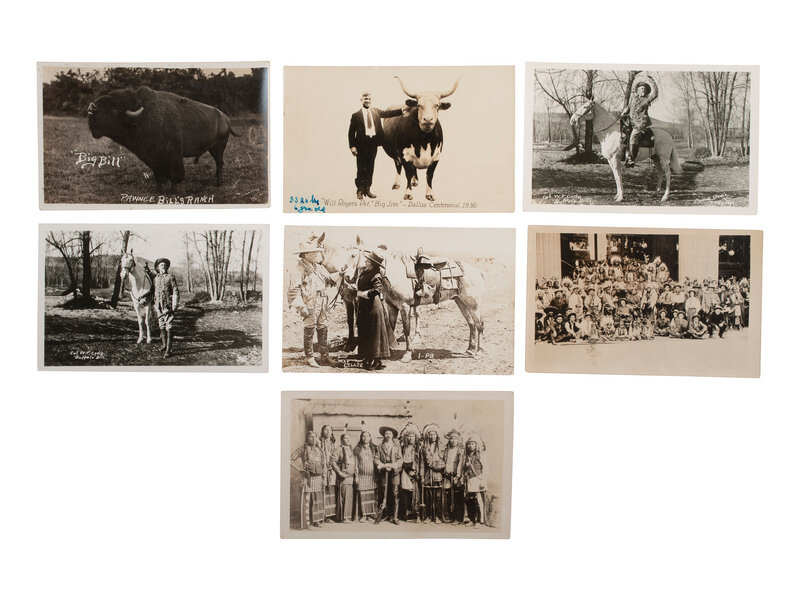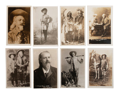The lot includes the following: 29 real photo postcards, 3 1/2 x 5 1/2 in., or smaller, most unused, featuring studio and outdoor portraits of William F. "Buffalo Bill" Cody at varying ages, Pawnee Bill, Wild West performers, and other prominent figures from the American west. Many of the scenes are identified in the negative.