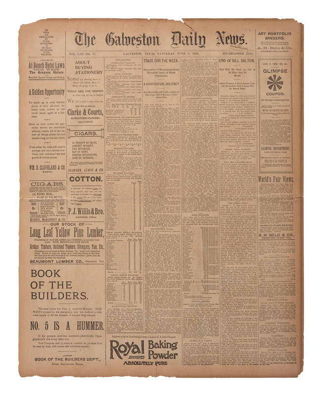 Vol. LIII, No. 78. Galveston, TX: 9 June 1894. 8pp., folio, 22 x 17 1/2 in. This newspaper contains prominent, front-page “stacked” headlines and a lengthy, front-page account of the death of wild west outlaw, Bill Dalton, of the Dalton Brothers Gang.