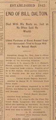 [OUTLAWS & LAWMEN]. Galveston Daily News. Front-page report of the "End of Bill Dalton."
