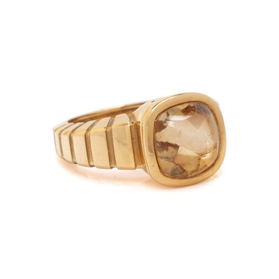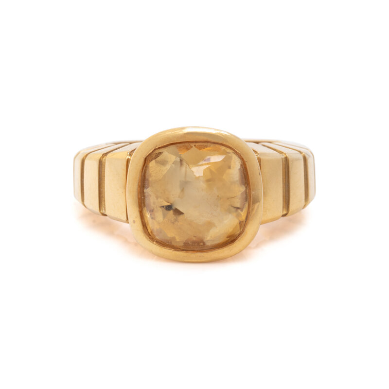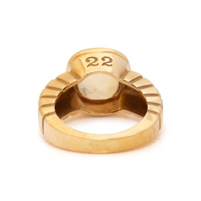 Buff top citrine measuring approximately 10.50 x 10.50 x 9.00 mm. Yellow gold. Ring size 7 3/4.