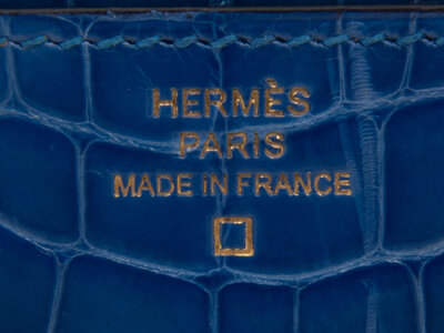 Additional Information: Gold-plated hardware; snap H closure to exterior flap; blue lambskin lining; three main interior compartments, the central compartment with zipper closure; interior slip pockets.